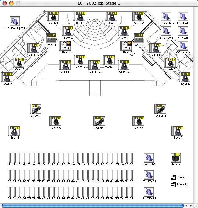 The first LCX controlled the fixed (theatrical) lighting and Snow Machines and used 6 layers, as follows: