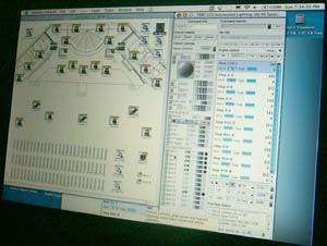The show was often programmed on two separate computers by two operators, working on different aspects of the show. All communication was done via TCP/IP and wireless 802.11b communication on Powerbooks. This made programming very nice, to be able to walk up on stage and do moving light and laser positioning. This also allowed me to control/monitor the system from home via the internet.
